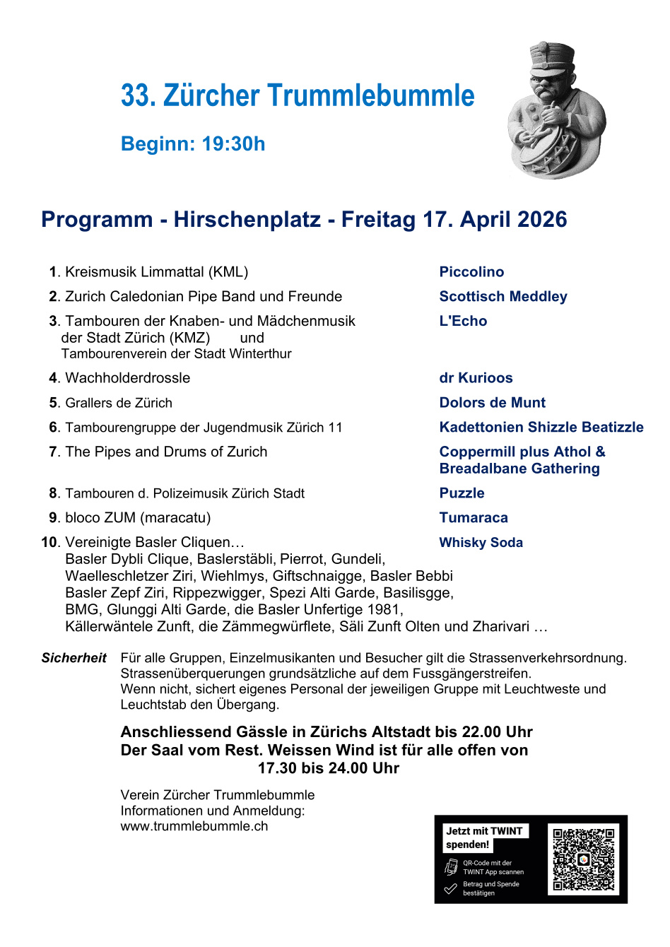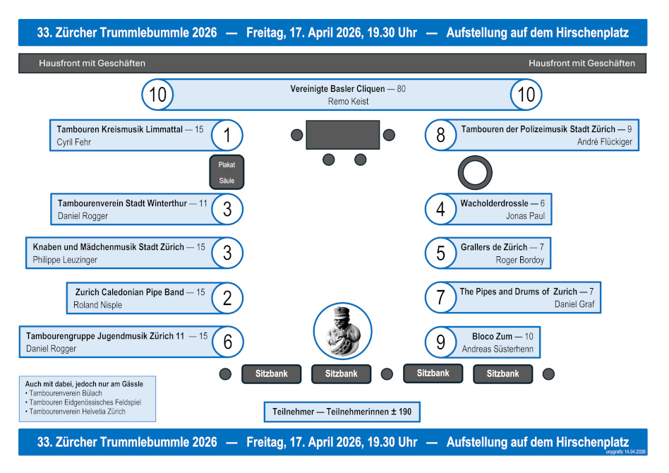 33. Zürcher Trummlebummle: Freitag, 17. April 2026,19:30 Uhr auf dem Hirschenplatz – jetzt anmelden!